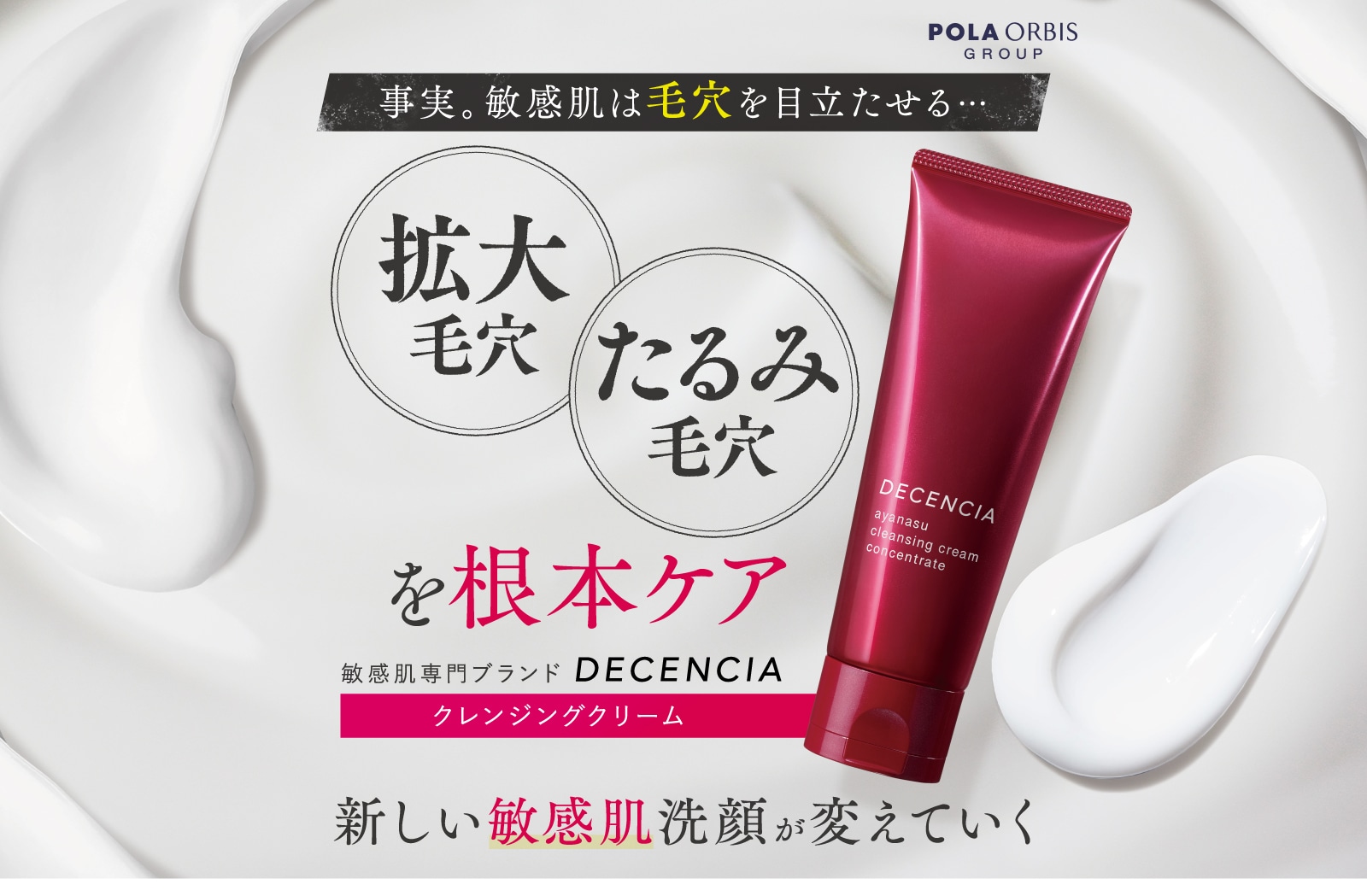 <ポーラ・オルビスグループの敏感肌専門ブランド「ディセンシア」> 大ヒット・敏感肌用エイジングケアシリーズ「ayanasu(アヤナス)」から 新たに誕生した「クレンジングクリーム」のご紹介です。 新事実!敏感肌が毛穴を目立たせていた。ということを解明。 クレンジングからアプローチを実現させました。