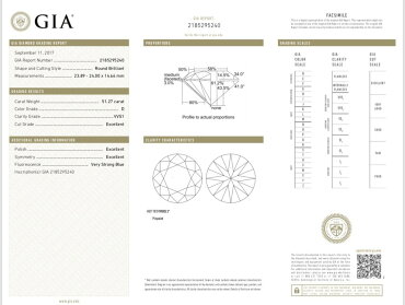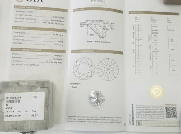 鑑定書とはダイヤモンドの鑑定書とは、正式名称をダイヤモンドグレーディングレポートと言い、GIA(米国宝石学会)が定めた品質評価国際基準であるる”4C”を基準として各鑑定機関によって独自の書式で発行されます。 鑑定書は、ダイヤモンドの重量と品質のグレードを根拠となる測定・検査結果とともに示したもので、4Cの明記とともにダイヤモンドの写真や各部のサイズ(直径の最大と最小値、テーブル〜キューレットの深さ)、プロポーション(テーブル面の割合、クラウン角度、パビリオン角度、ガードルの厚さ等)、紫外線を照射したときの蛍光性の強さ、クラリティ特徴の記号による図示などの測定・検査結果が記載されます。