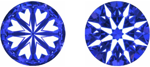 特殊な観察装置を用いてラウンドブリリアントカットのダイヤモンドを観察した時に、クラウン側に8つの「矢形」とパビリオン側に8つの「ハート形」の光学的現象パターンを表すダイヤモンドは「ハート&アロー*」あるいは「ハート&キューピッド*」と呼ばれています。一般的にこのようなパターンを示すダイヤモンドカットは、そのプロポーション以外にも「光学的対称性」が非常に優れており、GIAカットグレードでもベリーグッド以上に属します。