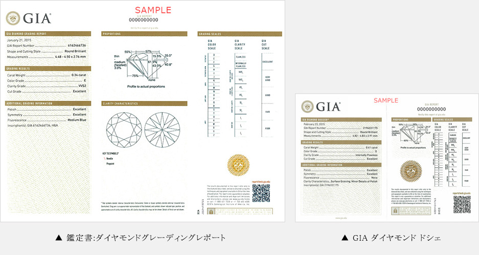 GIA鑑定書付きのダイヤモンドには「ダイヤモンド グレーティング レポート」もしくは、「GIA ダイヤモンド ドシェ」の2つのタイプがございます。